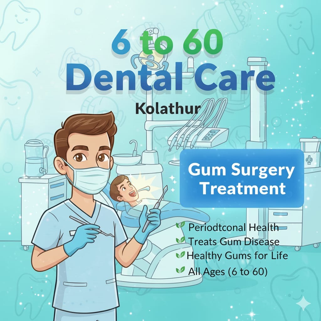 Healthy gums are the foundation of a strong and beautiful smile. At 6to60 Dental Care in Kolathur, Dr. Kumaresan P provides advanced gum surgery treatments to treat gum infections, receding gums, bleeding gums, and periodontal disease using safe, modern, and minimally invasive techniques. Best dentist for gum bleeding treatment in Kolathur Gum reshaping and flap surgery Kolathur Deep cleaning and gum disease treatment Kolathur Gum abscess and infection treatment in Kolathur Gum surgery near Peravallur Gum treatment near Villivakkam Best gum surgeon near Retteri Periodontal specialist near Perambur Gum disease clinic near Kolathur